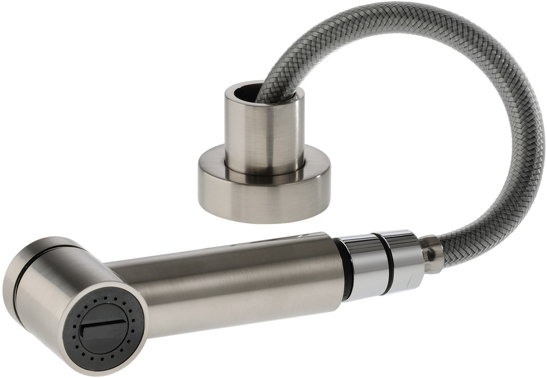 A modern Abode tap in brushed nickel with a brushed finish • Tap Dimensions: Overall Height – 158mm; Spout Height – 0-1200mm; Spout Reach – 140mm; Base/Handle Width – 50mm