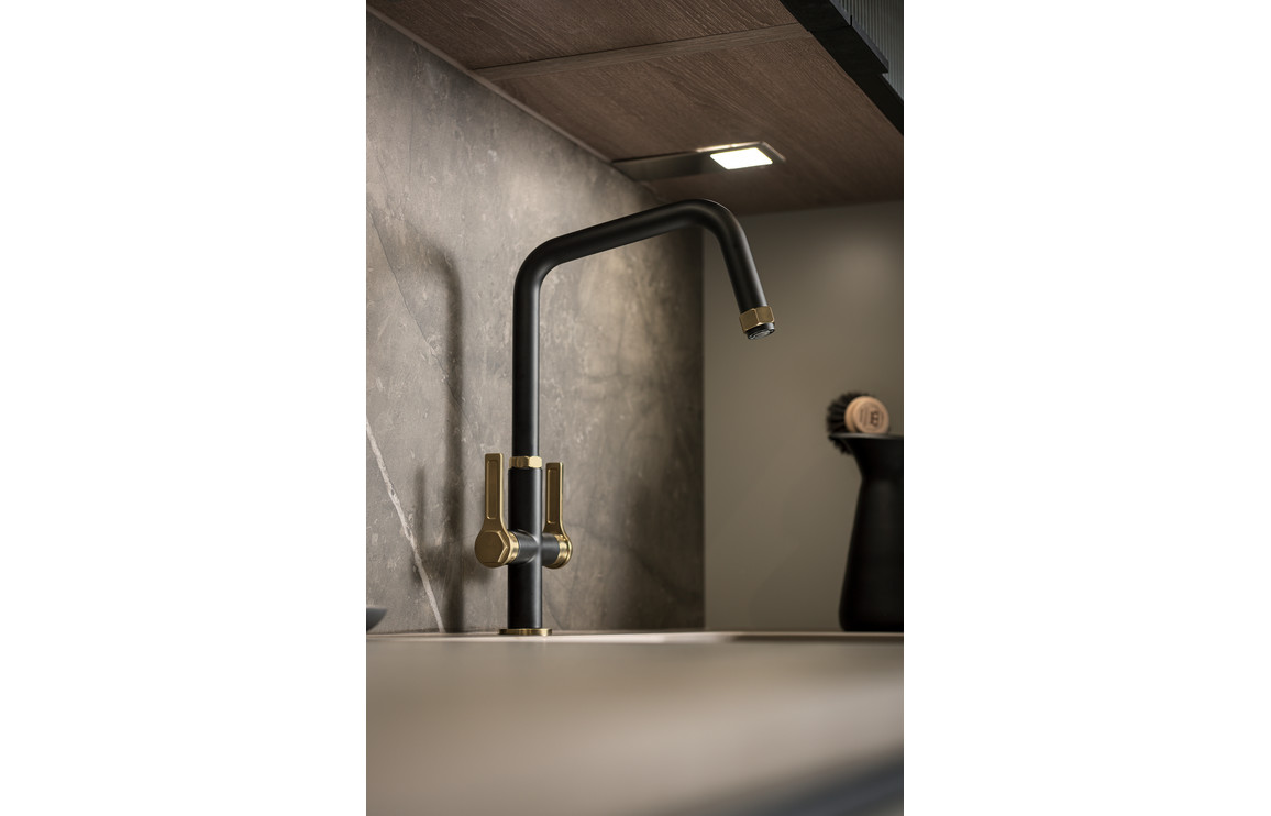 • A contemporary Abode Hex tap in antique brass & matt black with a matt finish