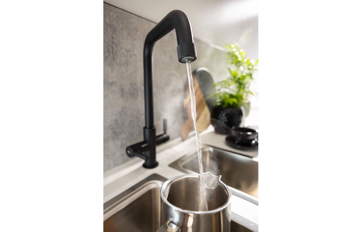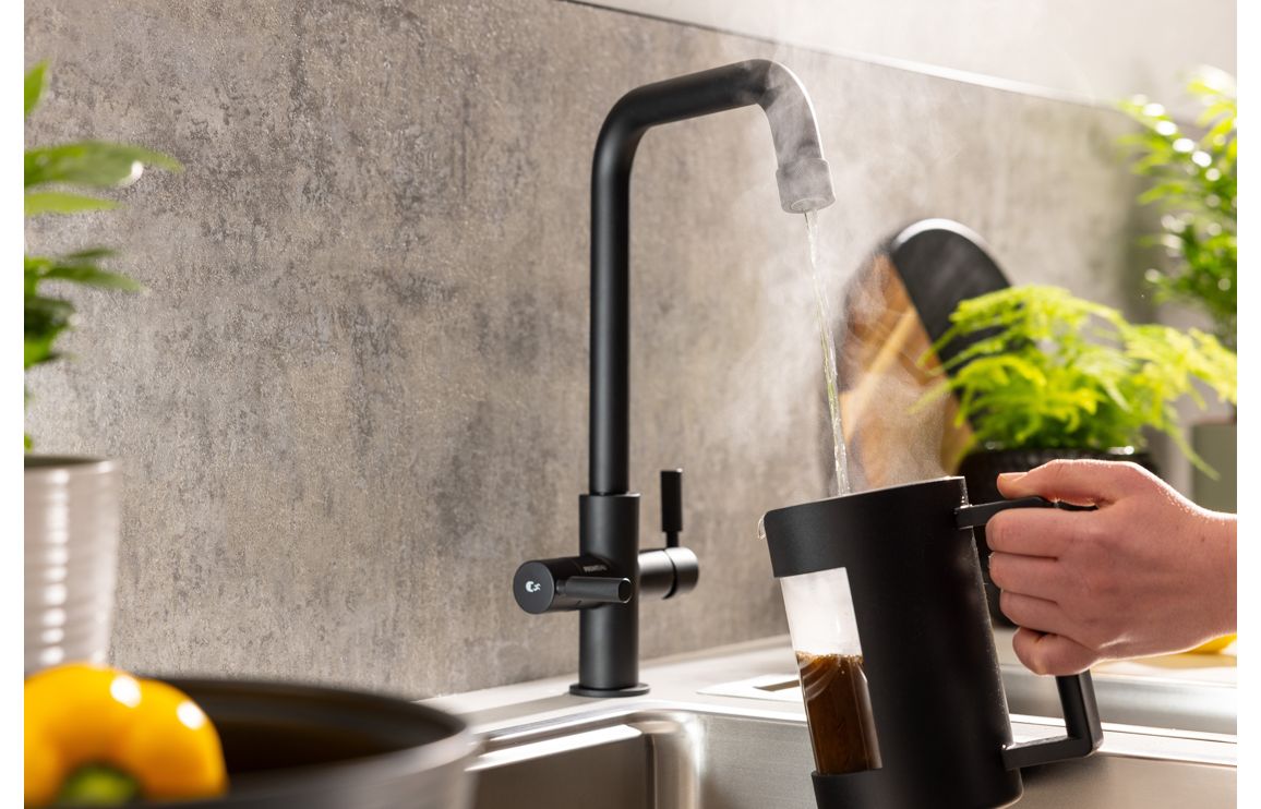 - Striking industrial chic designed mixer with matching slimline knurled handles and a base spout detail that delivers hot cold and heated filtered water