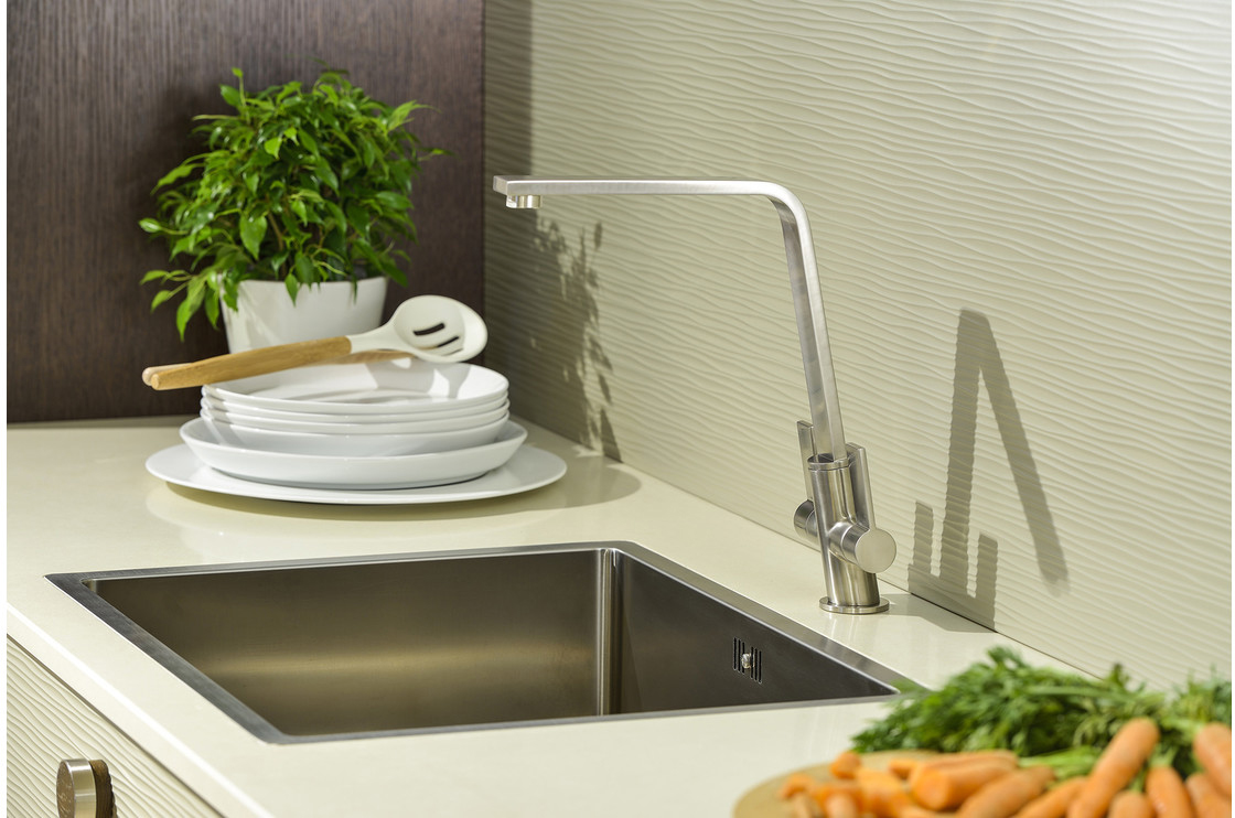 A contemporary Abode Linear Flair tap in brushed nickel with a brushed finish • Tap Dimensions: Overall Height – 303mm; Spout Height – 284mm; Spout Reach – 236mm; Base/Handle Width – 48mm