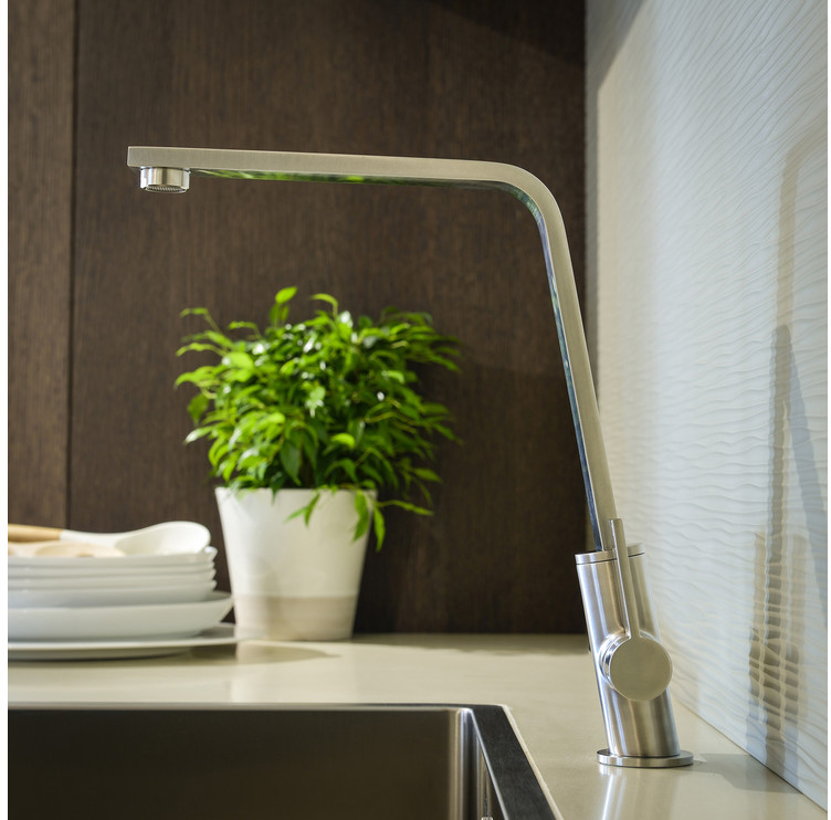 - A contemporary Abode Linear Flair tap in brushed nickel with a brushed finish