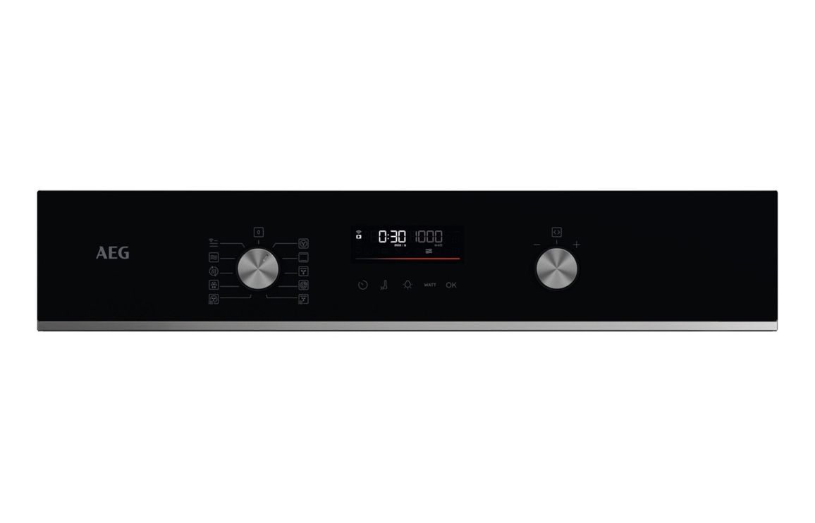 A built in AEG compact electric oven in black • 44 Litre Capacity • Dimensions: H 455 x W 595 x D 567mm