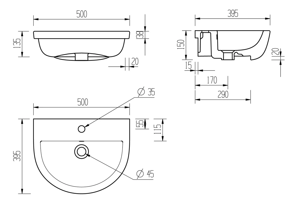 Includes: Semi Recessed Basin • Comes with 1 Tap Hole • Dimensions: H 150 x W 500 x D 390mm