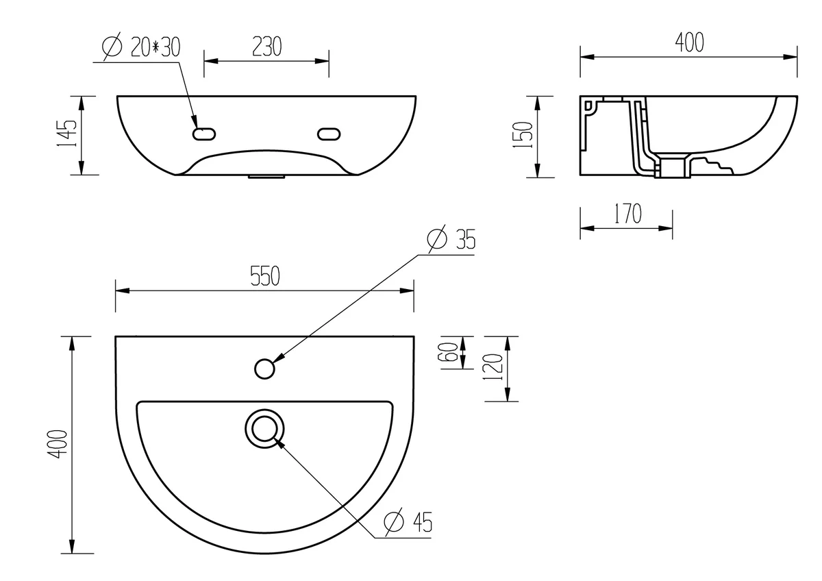 Includes: Basin & Full Pedestal • Comes with 1 Tap Hole • Dimensions: H 835 x W 550 x D 400mm