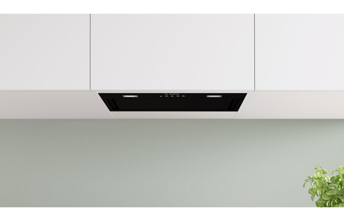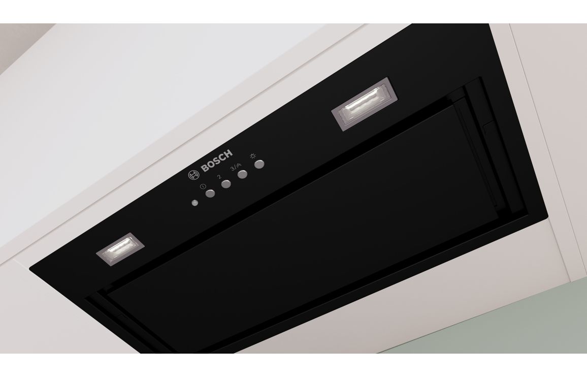 A Cabinet Fitted Bosch Canopy Hood in Black • Maximum Extraction: 570 m³/h • Dimensions: H 345 x W 520 x D 282mm
