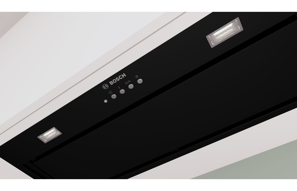 A Cabinet Fitted Bosch Canopy Hood in Black • Maximum extraction: 595 m³/h • Dimensions: H 345 x W 700 x D 282mm