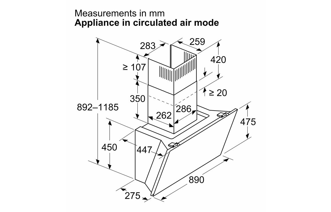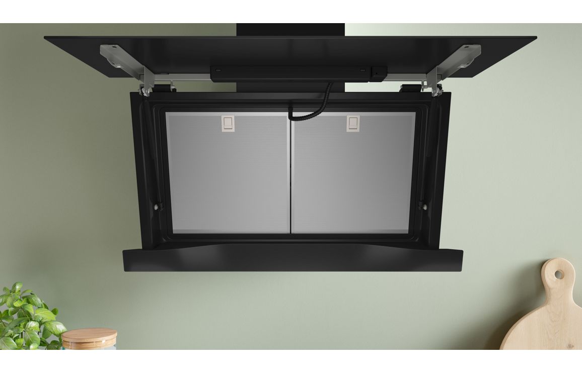 A Wall Mounted Bosch Chimney Hood in Black Glass • Maximum extraction: 441 m³/h • Dimensions: H 475 x W 890 x D 447mm