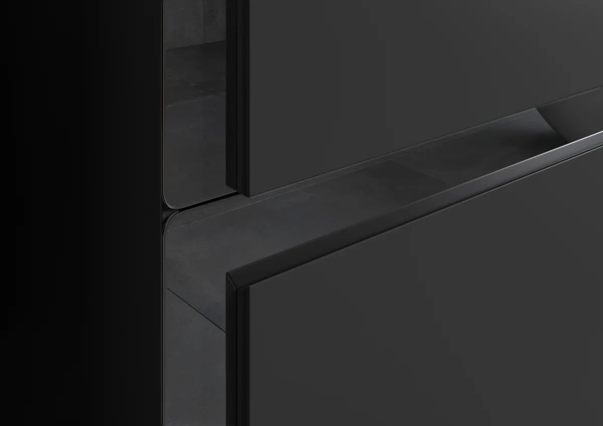 - Unique design with handleless doors and drawers offering a contrast of finishes