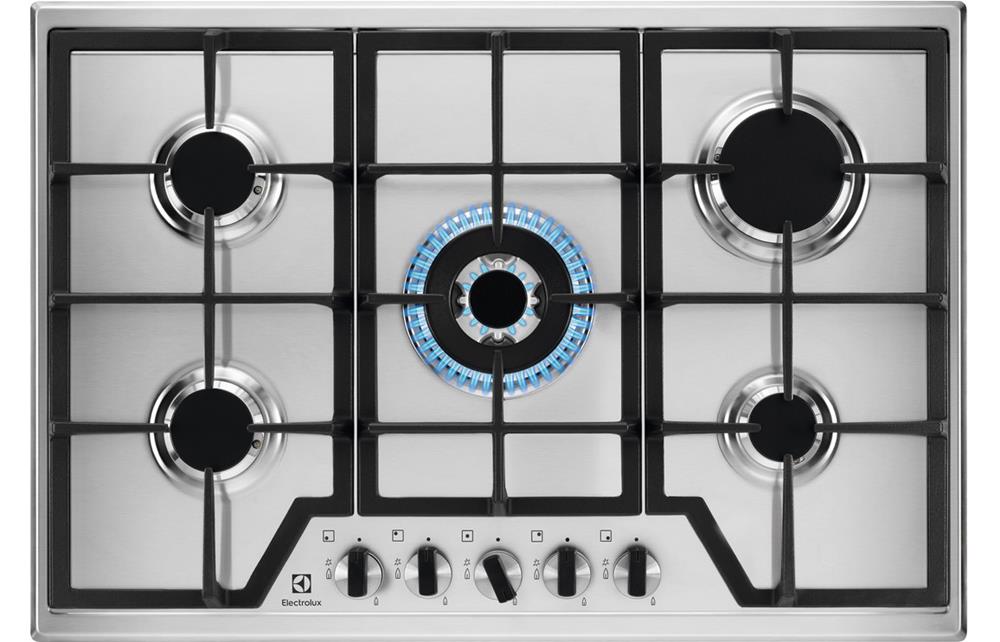 A Built In Electrolux Gas Hob in Stainless Steel • Number of Cooking Zones – 5 • Dimensions: W 744 x D 510mm