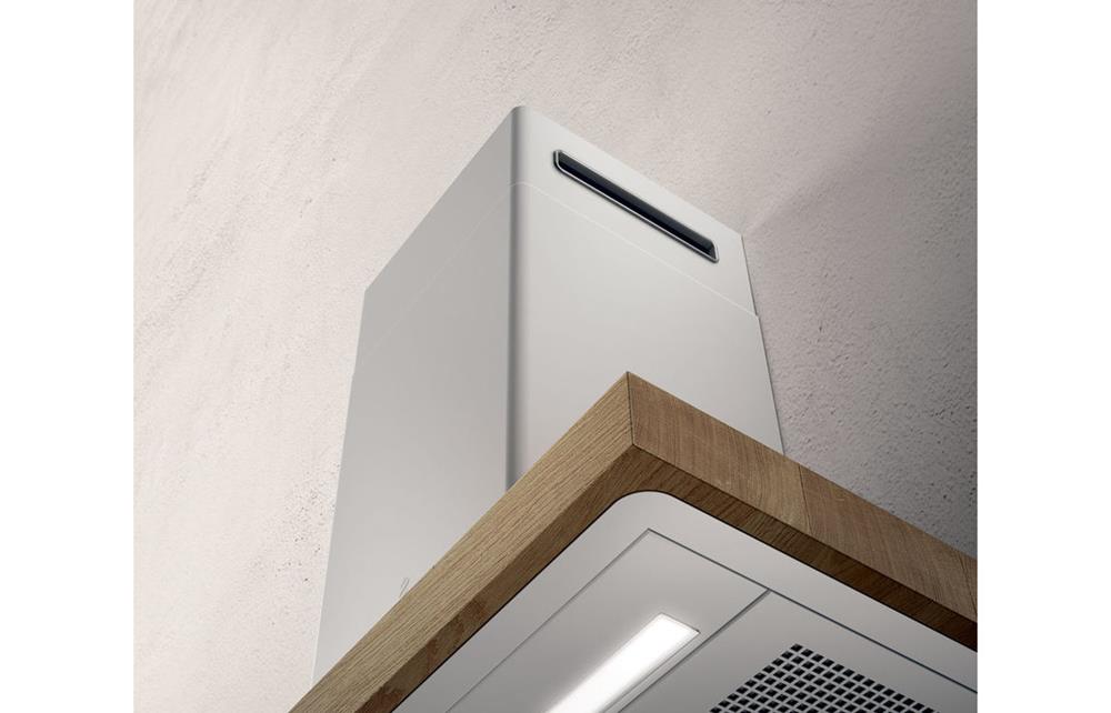 A Wall Mounted Elica Chimney Hood in White and Oak • Maximum extraction: 496 m³/h • Dimensions: H 775 – 1275 x W 1198 x D 525mm