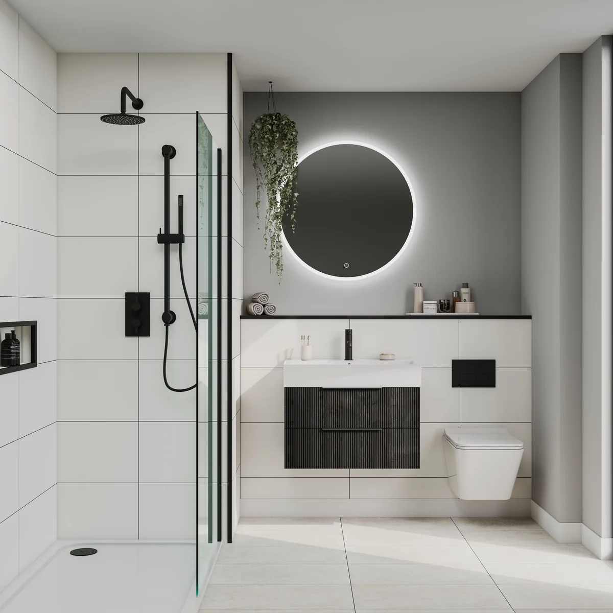 - White silk wall panels – classic clean and work well with everything! The perfect mix and match décor. The black grout line allows you to pair and style you black finishings to add a sophisticated feel to the bathroom.