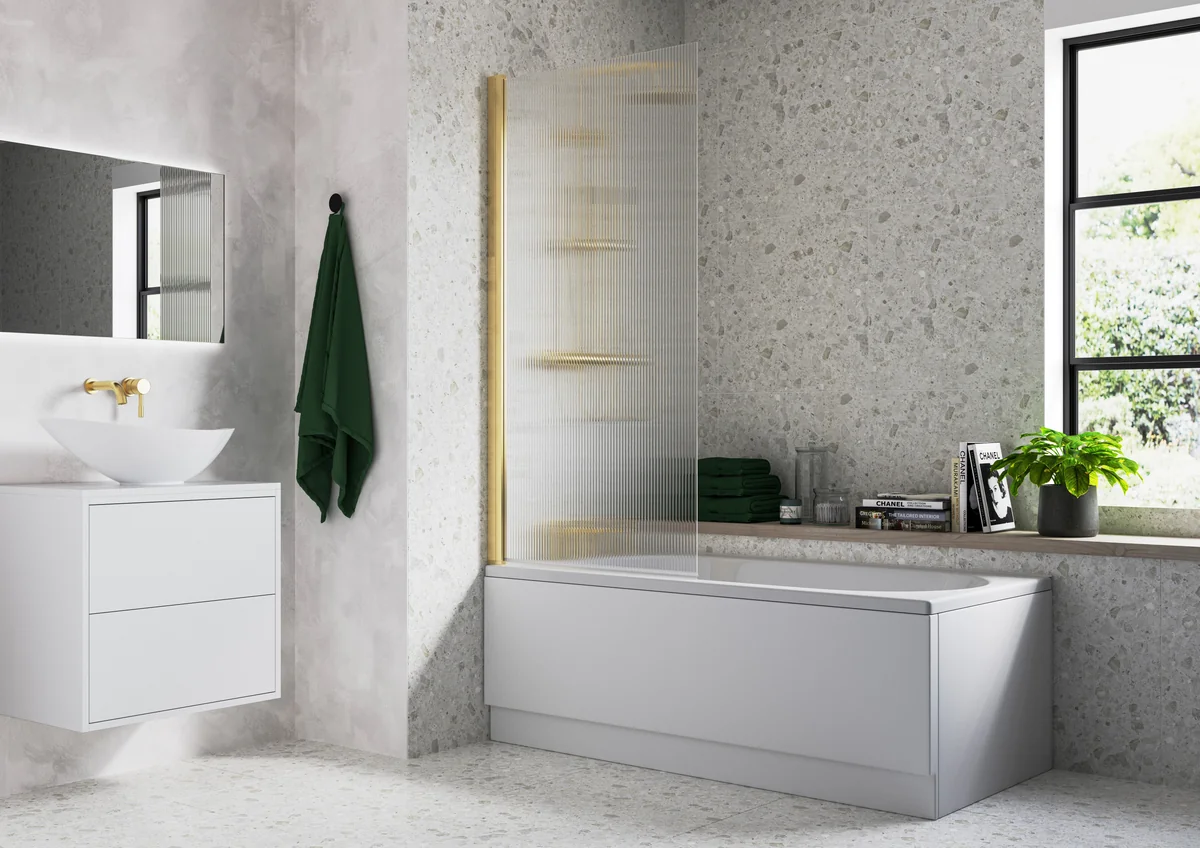 Novello Fluted 800 x 1500mm Single Straight Bath Screen (5mm) – Brushed Brass