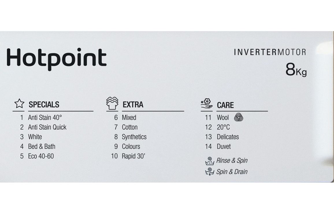 A Fully Integrated Hotpoint Washing Machine • 8kg Washing Load Capacity • Dimensions: H 545 x W 595 x D 815mm