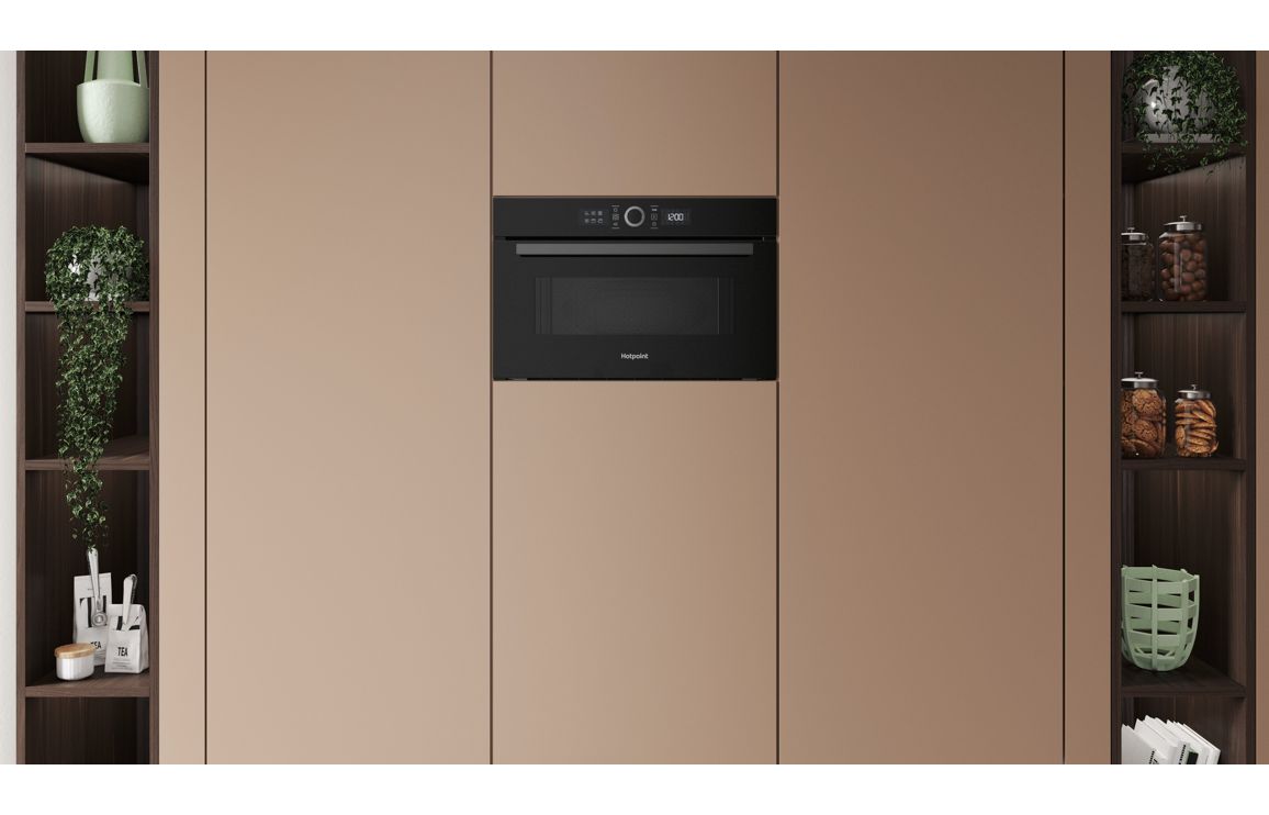 Built In Black Hotpoint Microwave & Grill • Power: 1000 Watts • Dimensions: H 385 x W 595 x D 468mm