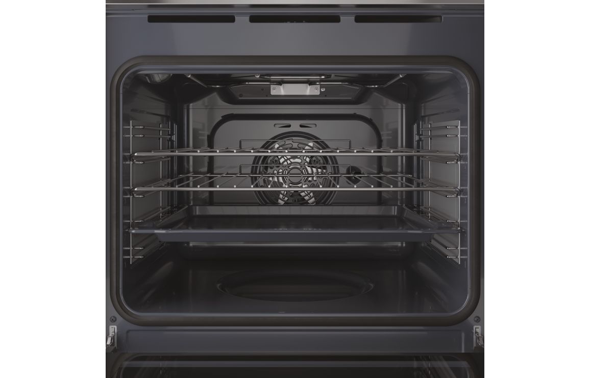A built in Hotpoint single electric oven in stainless steel • 71 litre capacity • Dimensions: H 595 x W 595 x D 551mm