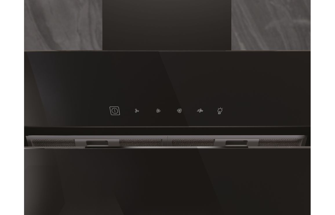A Wall Mounted Hotpoint Chimney Hood in Black • Maximum Extraction: 570 m³/h • Dimensions: H 504 x W 898 x D 368mm