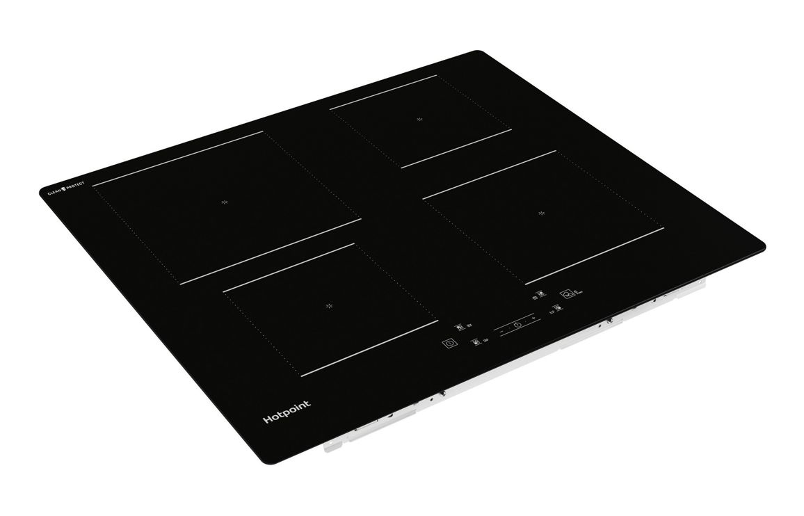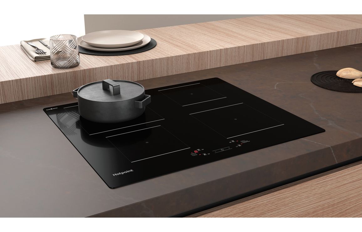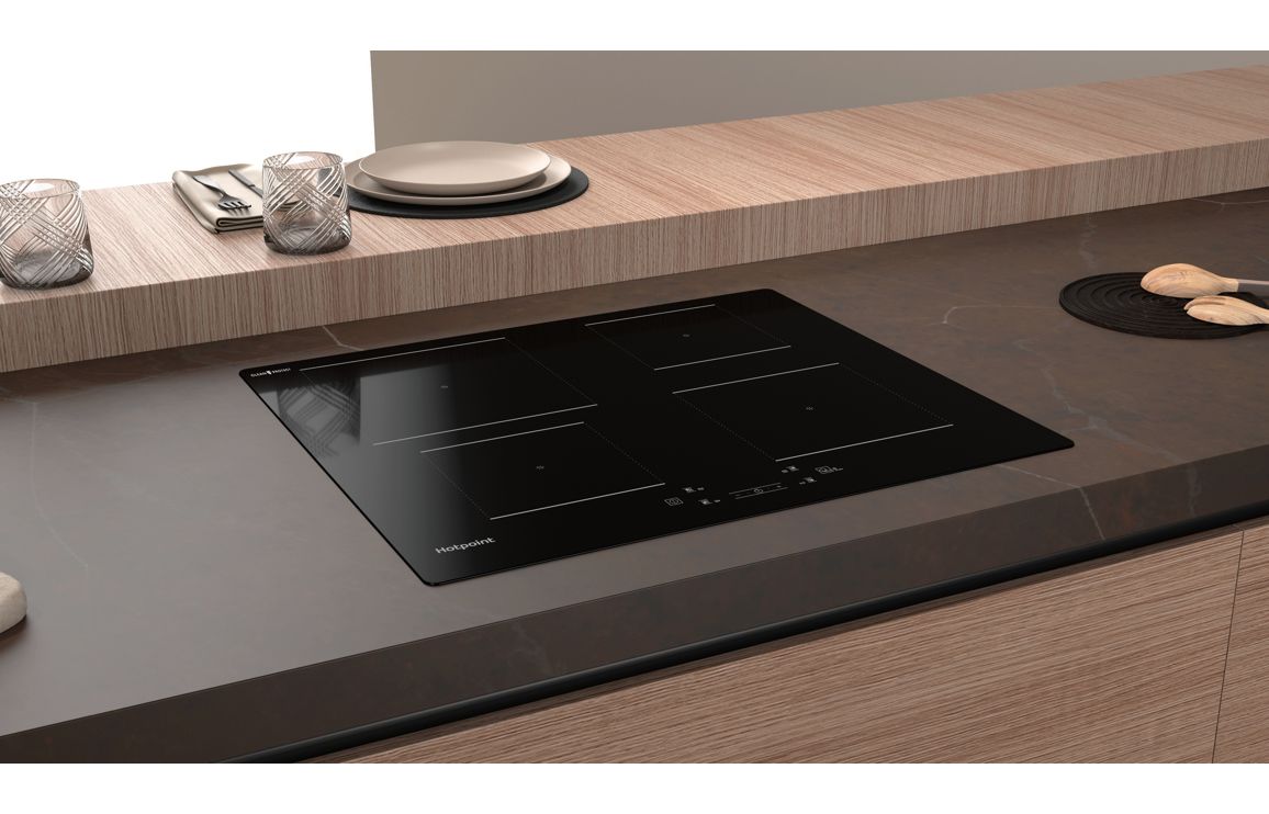 A Built In Hotpoint Induction Hob in Black • Number of Cooking Zones – 4 • Dimensions: H 54 x W 590 x D 510mm