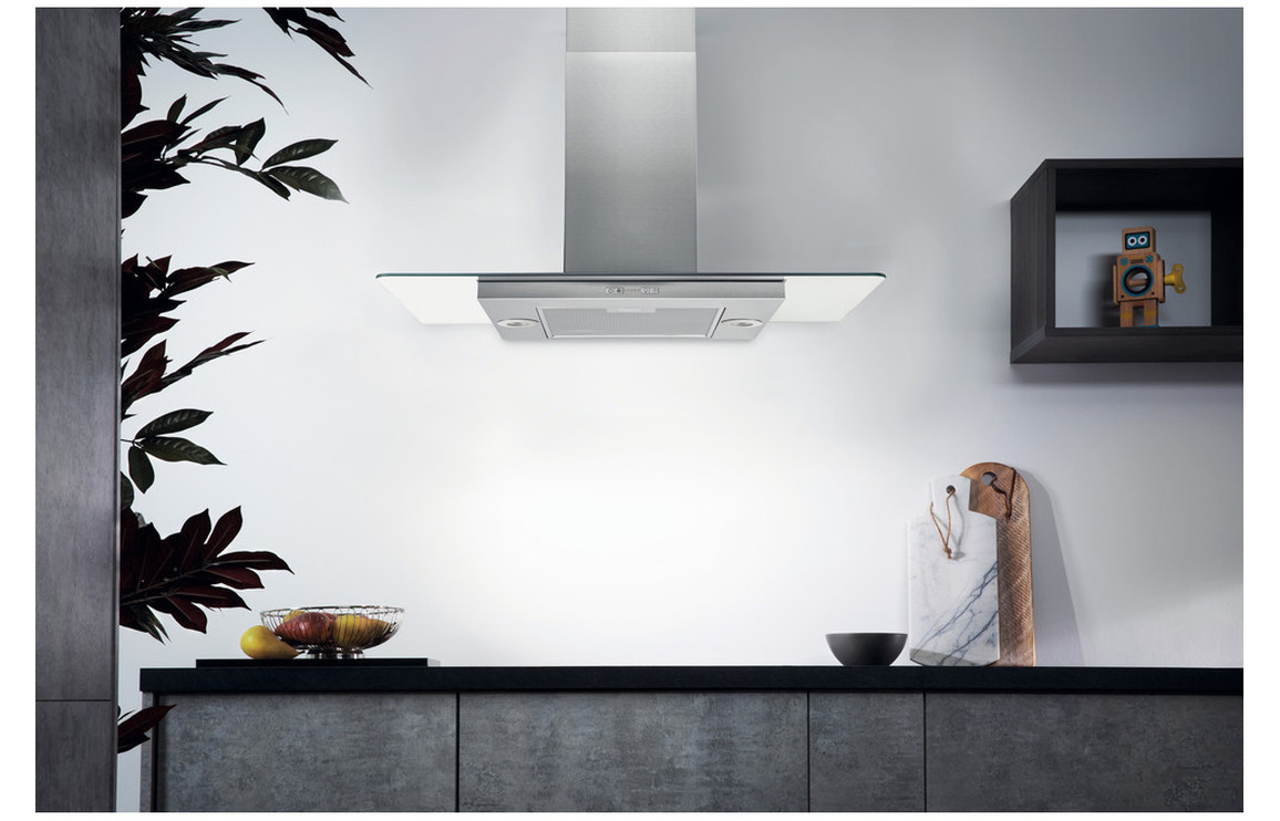 A Ceiling Fitted Hotpoint Island Hood in Stainless Steel & Glass • Maximum Extraction: 647 m³/h • Dimensions: H 690 x W 898 x D 598mm