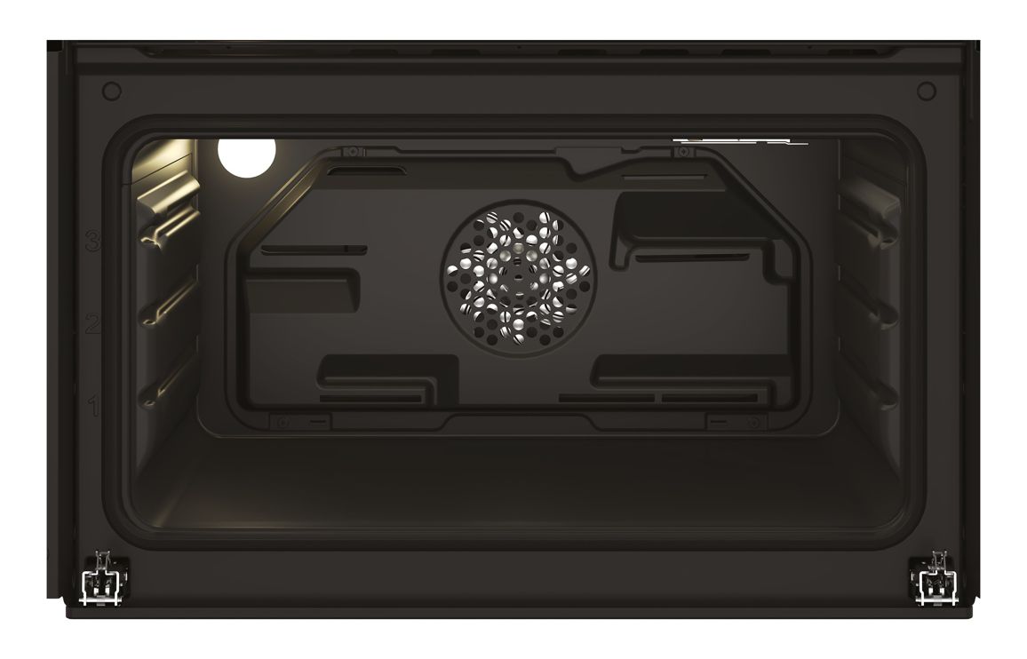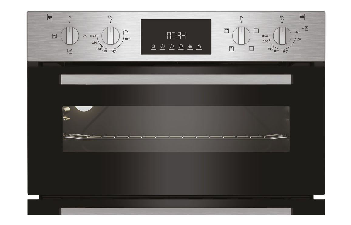 A built under Indesit double electric oven in stainless steel • 48/36 litre capacity • Dimensions: H 715 x W 594 x D 575mm