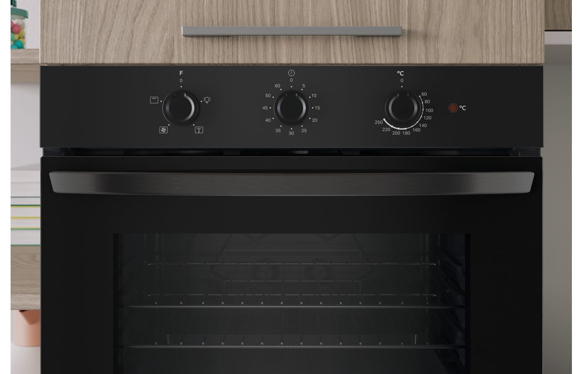 A built in Indesit single electric oven in black • 71 litre capacity • Dimensions: H 595 x W 595 x D 551mm