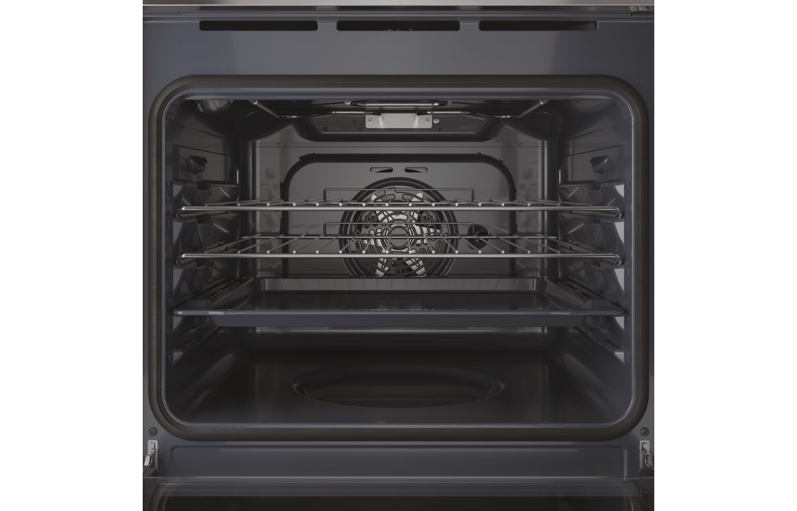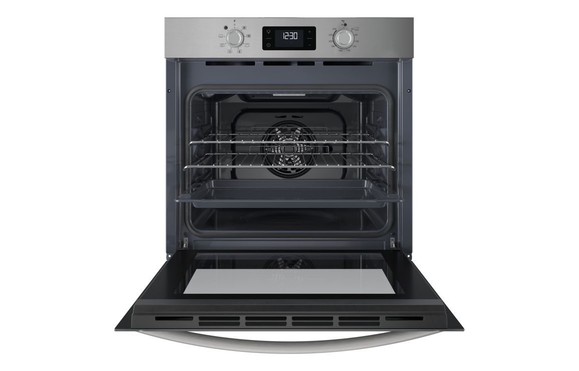 A built in Indesit single electric oven in stainless steel • 66 litre capacity • Dimensions: H 595 x W 595 x D 551mm