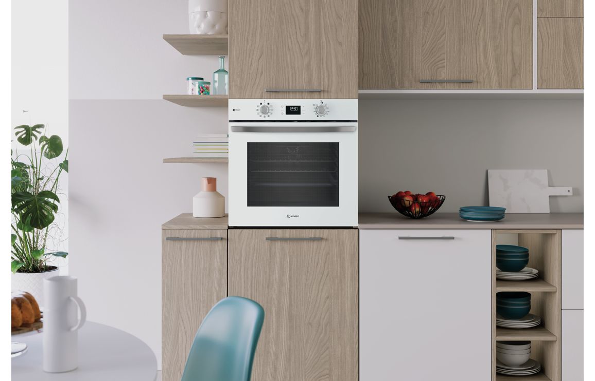 A built in Indesit single electric oven in white • 71 litre capacity • Dimensions: H 595 x W 595 x D 551mm