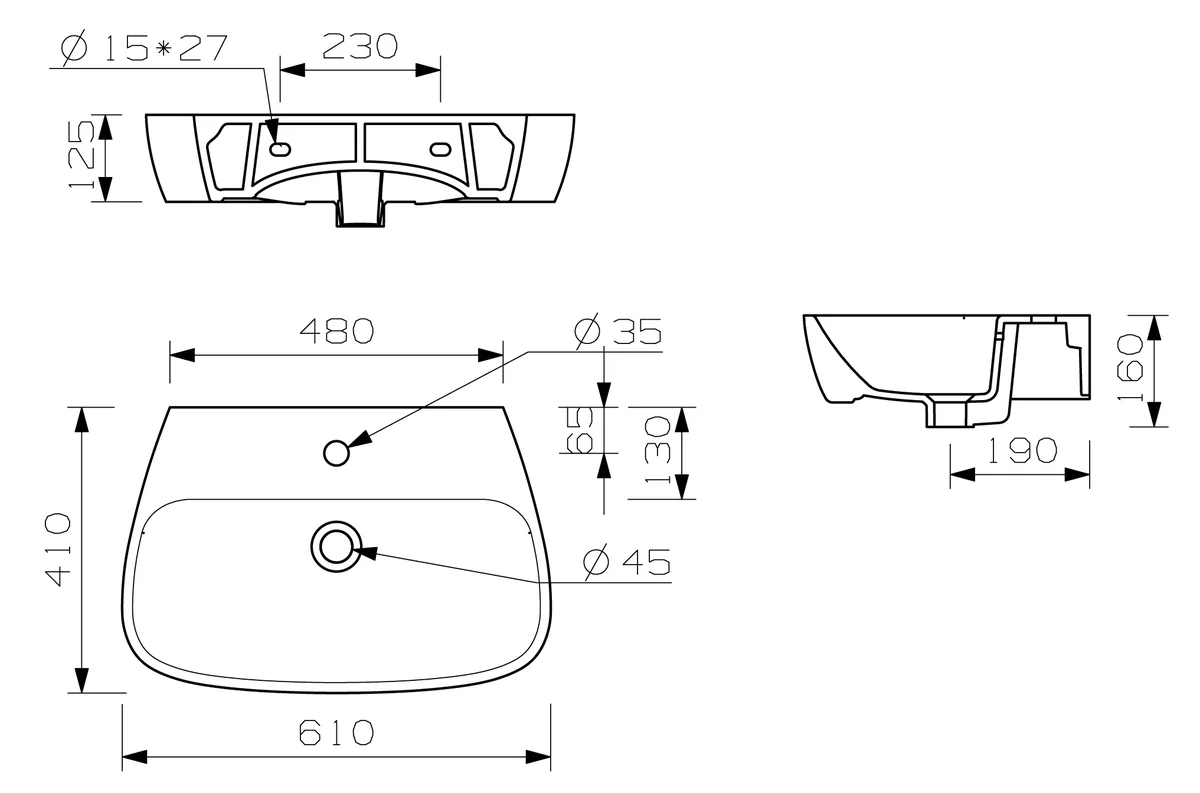Includes: Basin & Semi Pedestal • Comes with 1 Tap Hole • Dimensions: H 435 x W 600 x D 400mm