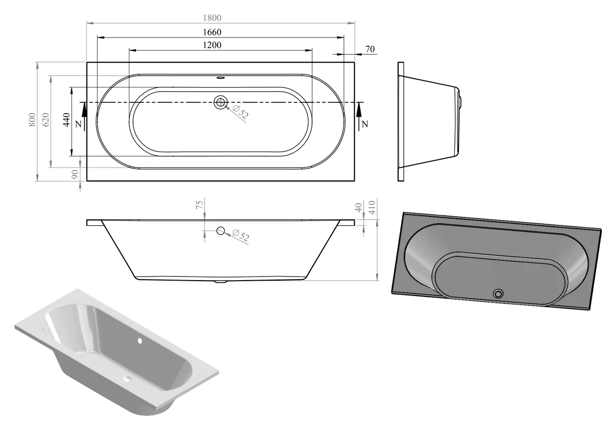 Double end modern straight bath • 210 litre capacity • Dimensions: L 1800 x W 800 x H 550mm