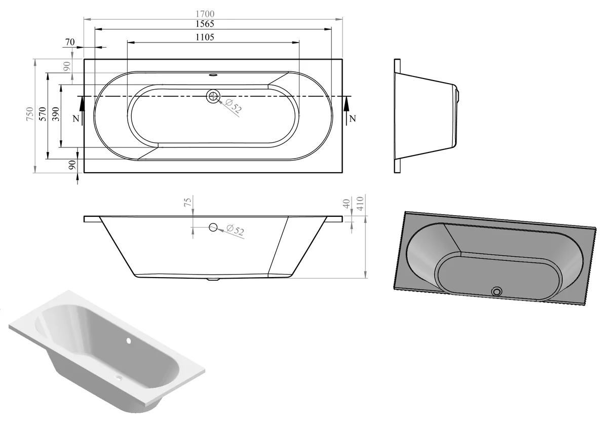 Double end modern straight bath • 190 litre capacity • Dimensions: L 1700 x W 750 x H 550mm