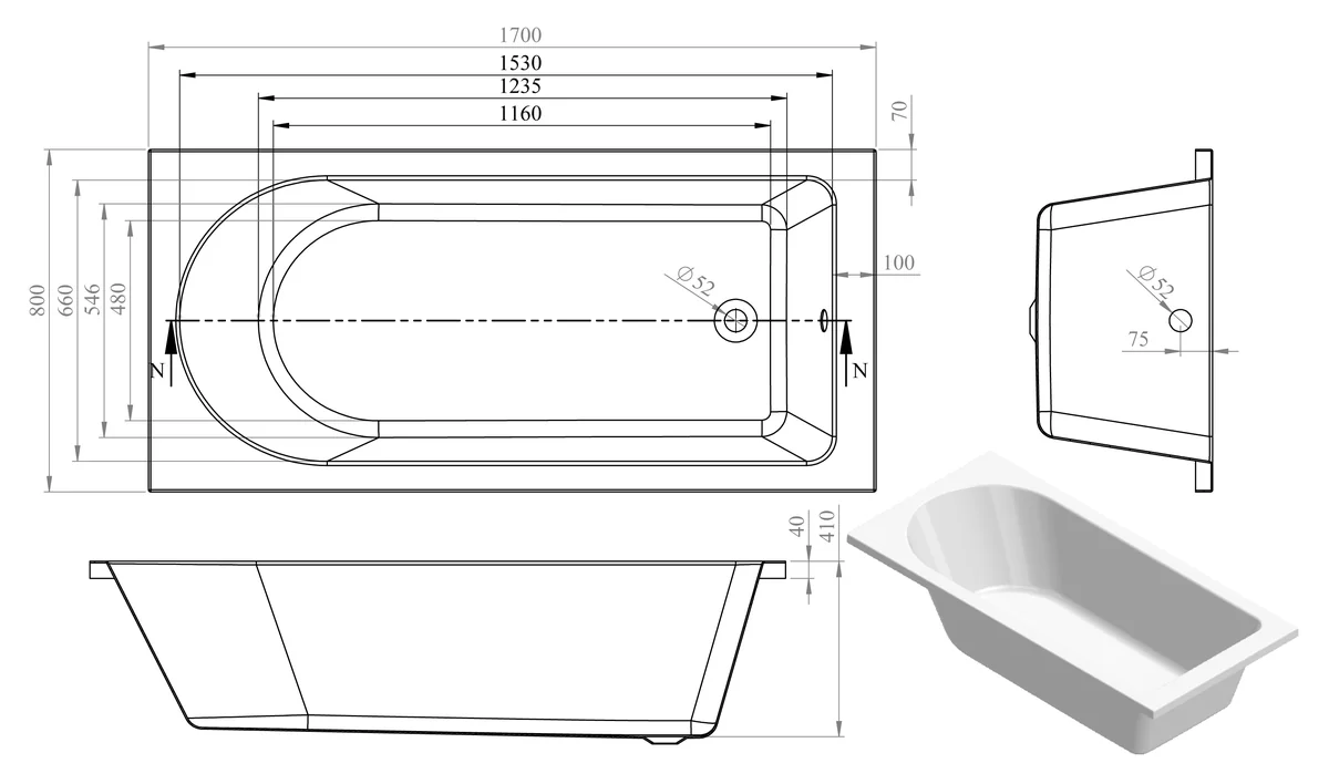Single end modern straight bath • 190 litre capacity • Dimensions: L 1700 x W 800 x H 550mm