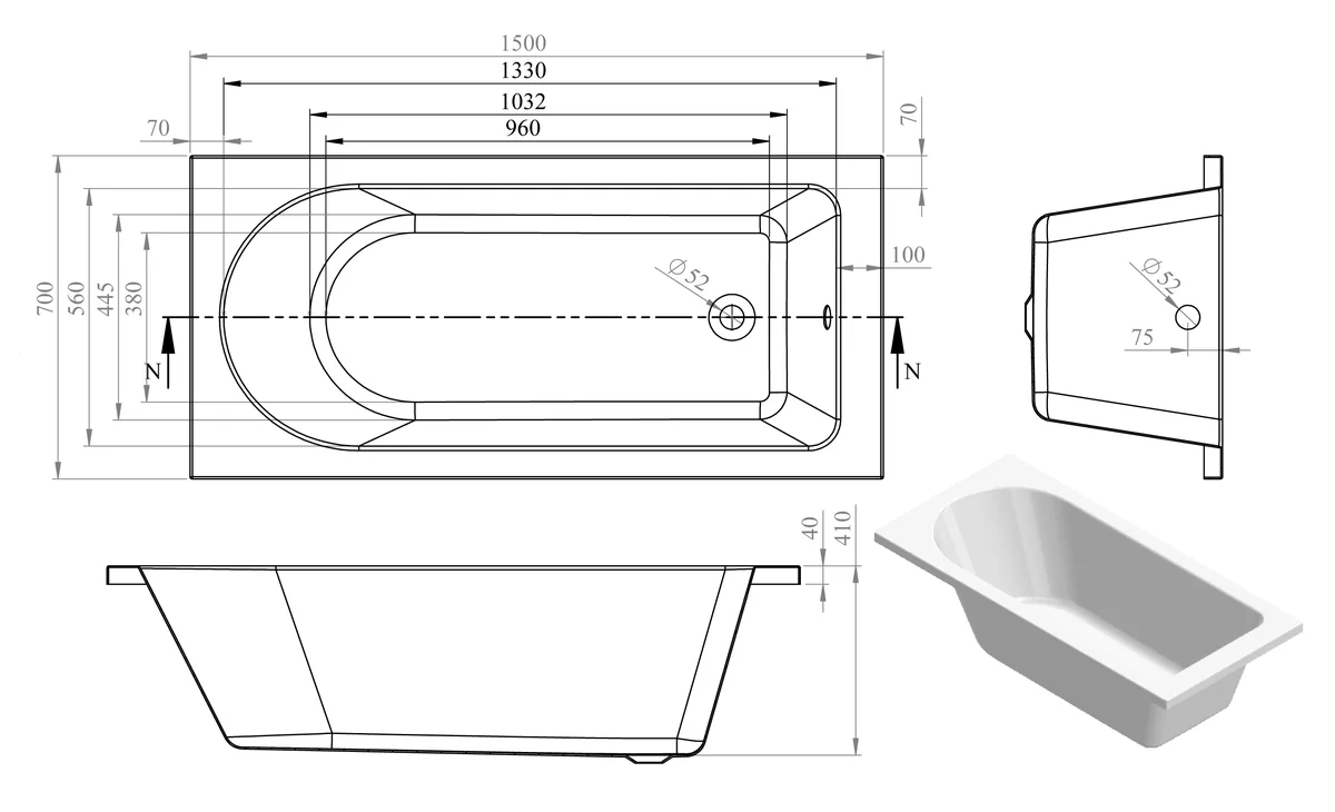 Single end modern straight bath • 160 litre capacity • Dimensions: L 1500 x W 700 x H 550mm