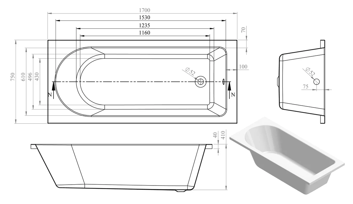 Single end modern straight bath • 180 litre capacity • Dimensions: L 1700 x W 750 x H 550mm