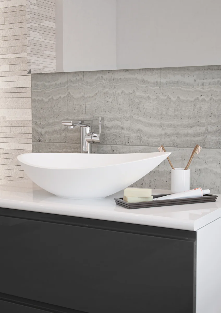 Includes: Countertop/Vessel Washbowl • Made from White Resin • Dimensions: H 173 x W 564 x D 323mm