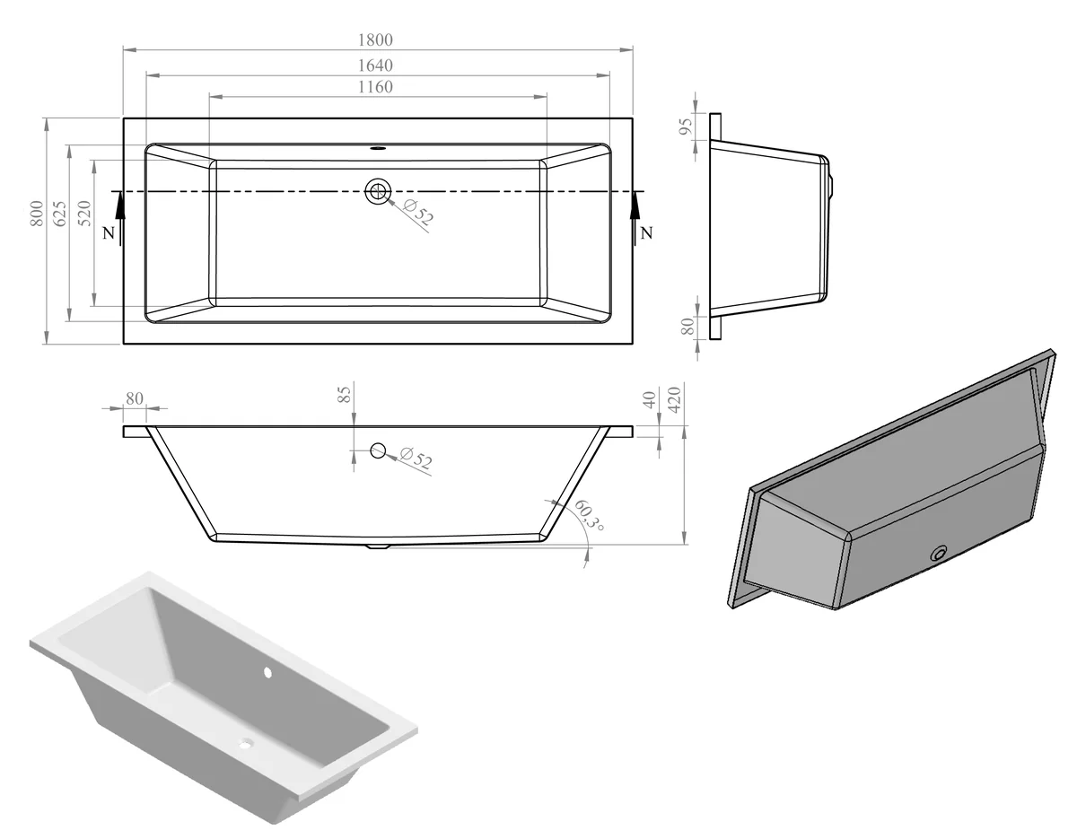 Double end modern straight bath • 235 litre capacity • Dimensions: L 1800 x W 800 x H 550mm