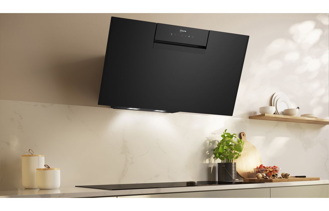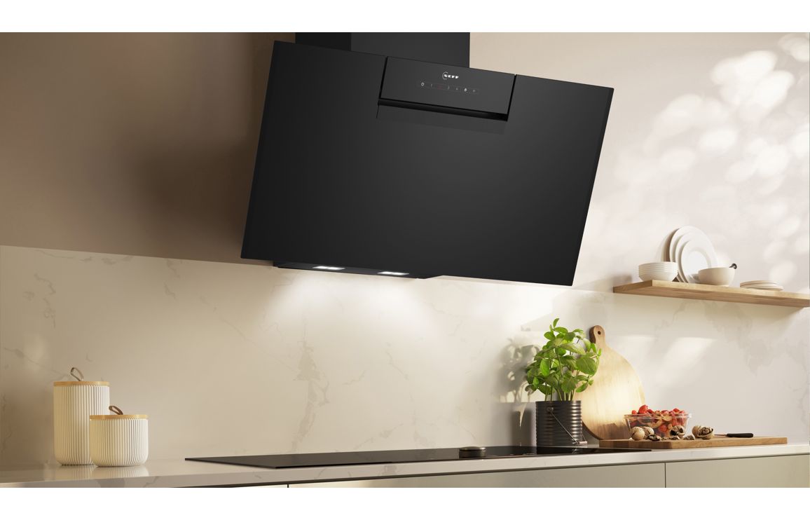 A Wall Mounted Neff Chimney Hood in Black Glass • Maximum extraction: 431 m³/h • Dimensions: H 320 x W 790 x D 433mm