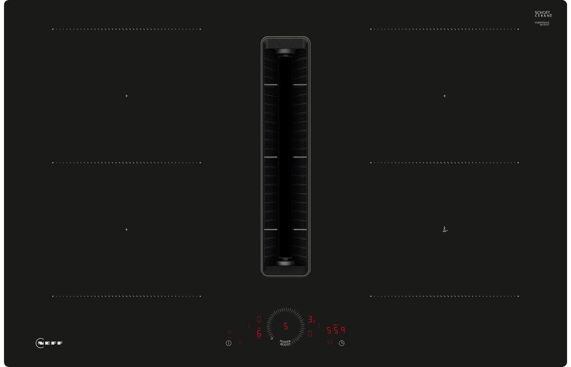 A Built In Neff Venting Induction Hob in Black Glass • Number of Cooking Zones – 4 • Dimensions: H 223 x W 802 x D 522mm