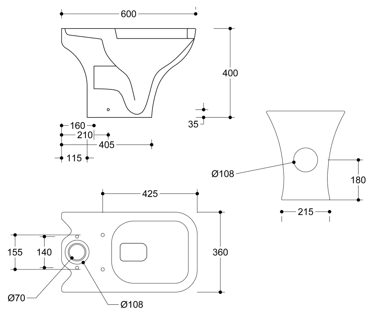 Includes Close Coupled Pan Cistern & Seat only • Distance from soil pipe spigot to wall: 155mm • Dimensions: H 785 x W 360 x D 600mm