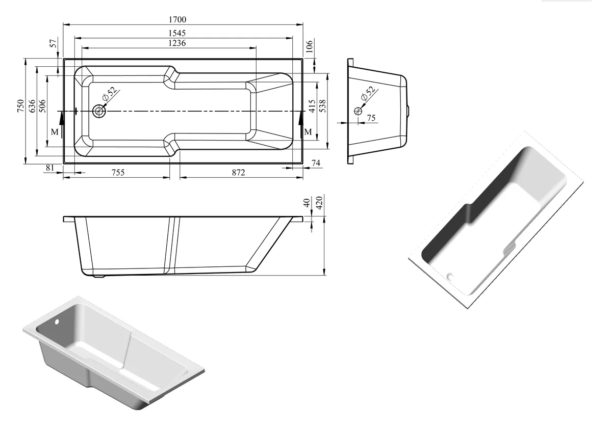 Single end modern straight bath • Comes with 0 tap holes – ready to drill • Dimensions: L 1700 x W 750 x H 550mm
