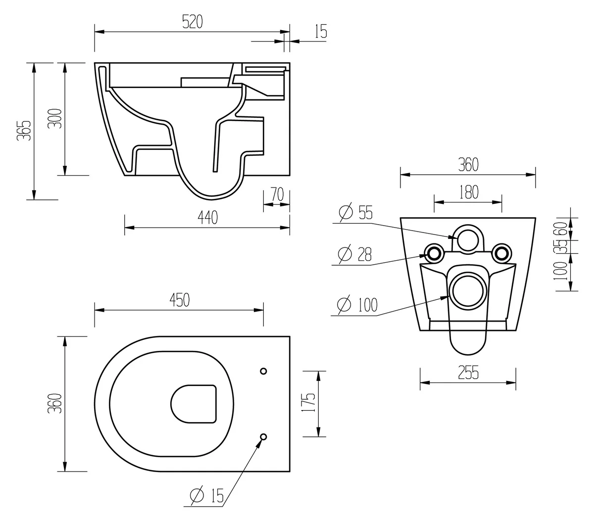 Includes Wall Hung Pan & Seat only • Distance from soil pipe spigot to wall: 75mm • Dimensions: H 365 x W 360 x D 520mm