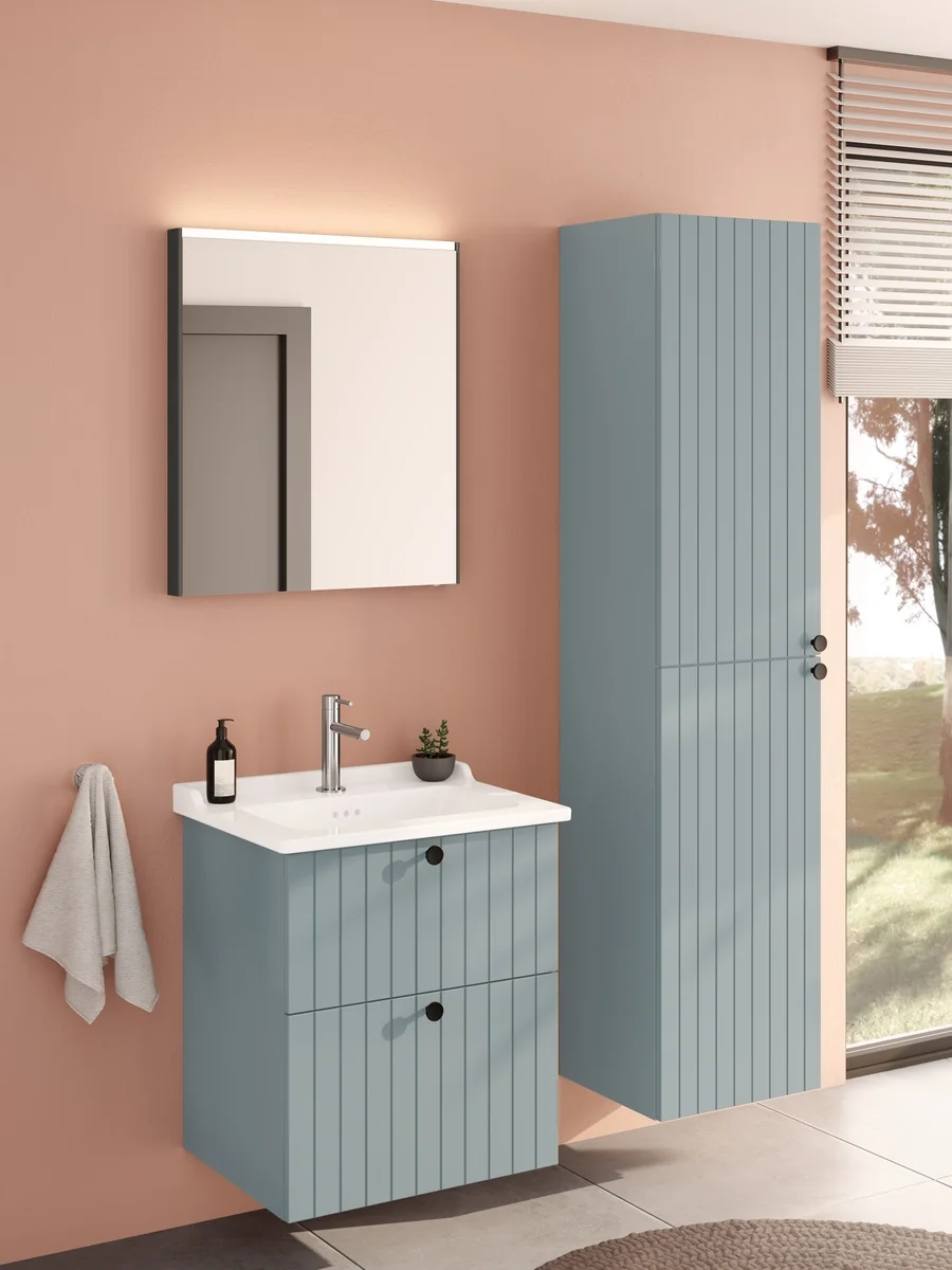 Root furniture comes in three styles – Groove Classic and Flat. Root Groove offers a contemporary bathroom design with matt colour options and stylish door detail. • Available in matt white matt light grey matt grey matt fjord green matt graphite matt dark blue and matt retro green. • Dimensions: H 1800 x W 420 x D 360mm